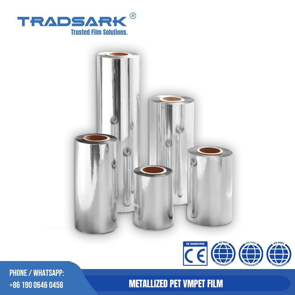 Our Metallized PET VMPET Film is produced in our ISO9001, ISO14001, ISO45001 certified factory in Weifang, China. We use advanced German technology and strict quality control to ensure every roll meets international standards for durability, barrier performance, and eco-friendliness. Tradsark is committed to providing reliable, sustainable, and energy-efficient film solutions for clients worldwide.